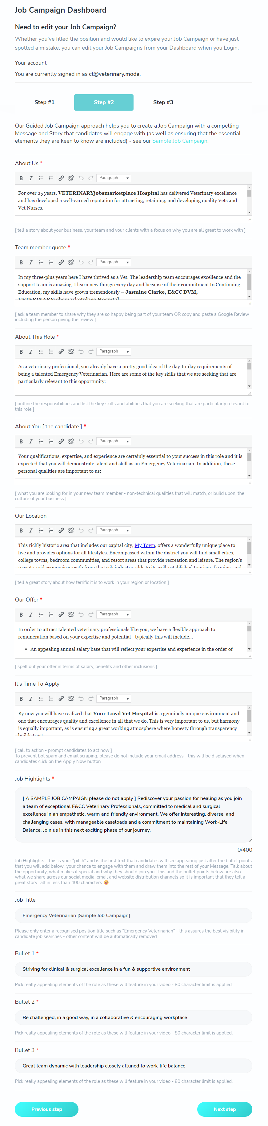 At Veterinary Jobs Marketplace, we understand the unique challenges veterinary organizations face when recruiting new team members. Recognizing that crafting an engaging job advertisement is not a routine task for most, we’ve developed our Guided Job Campaign approach. Designed to streamline the process, it turns what can be a daunting task into a simple, straightforward experience. Our aim? To empower you to create captivating job listings with ease and confidence.